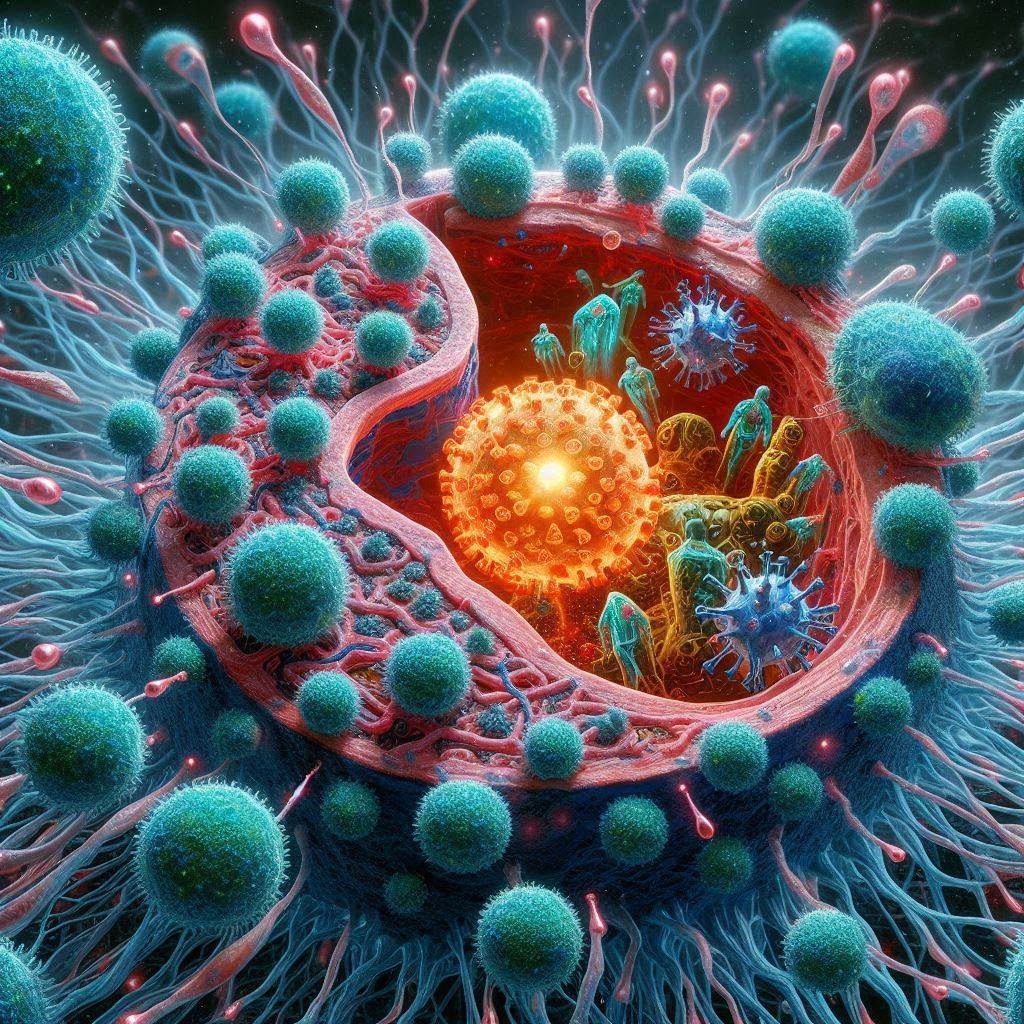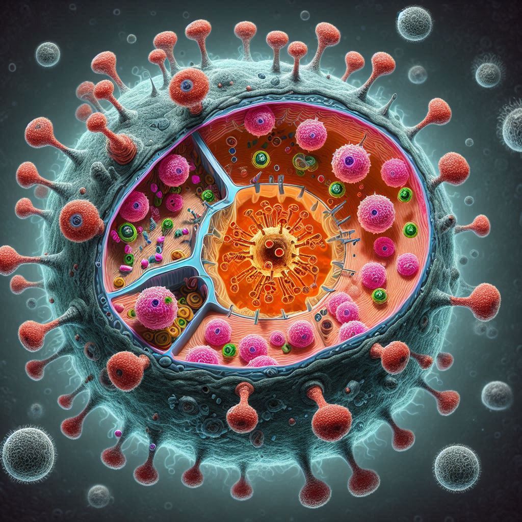 바이러스가 숙주 세포에 침입하면, 세포 내에서 증식하며 세포를 파괴합니다. 이 과정에서 숙주의 면역 시스템이 활성화되어 바이러스와 싸웁니다.